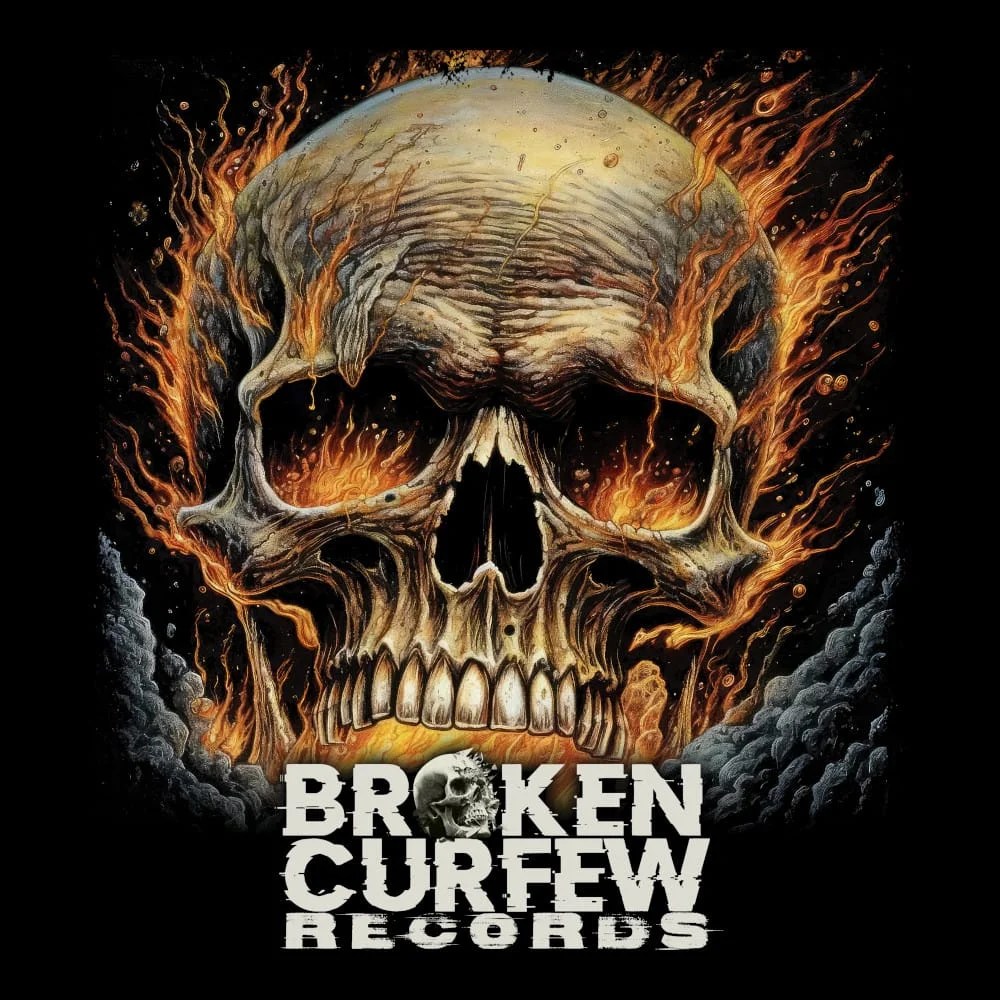 Broken Curfew Records – Flaming Skull – Black Denim Printed Patches (2 sizes)