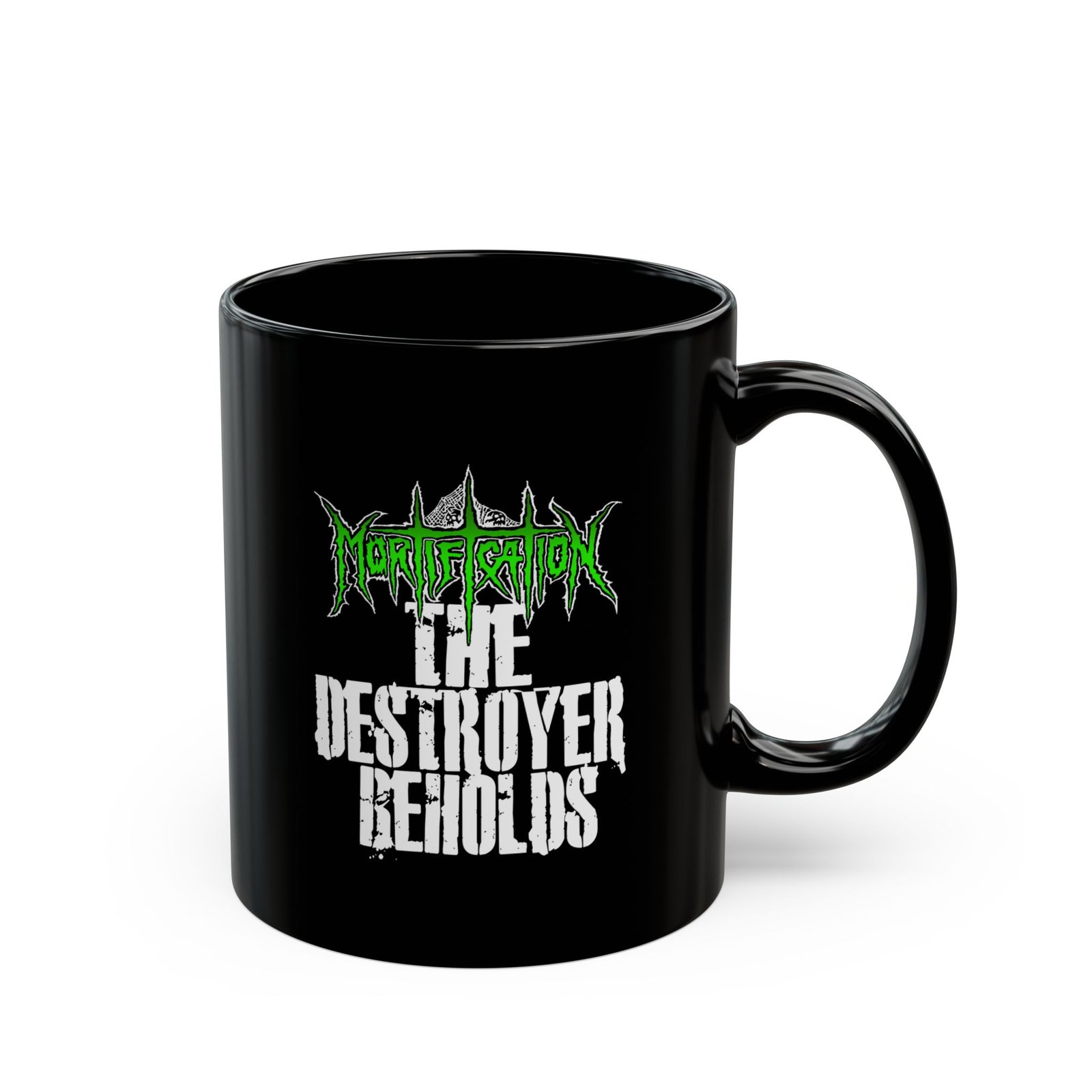 Mortification – The Destroyer Beholds 11oz Black Mugs (Green)